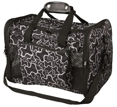 De zwarte Trixie Adrina hondentas met botprint van 42X26X27 cm is een handige draagtas waarmee je je hond zo mee op reis neemt.