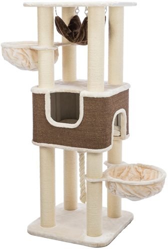 De Trixie Krabpaal Humberto XXL Creme / Donkerbruin van 174 cm is een extra stevige krabpaal, bijzonder geschikt voor grote katten, met schuilplaats, slaapzakken en hangmat. Deze krabpaal is compact, maar toch stevig en biedt veel verschillende plaatsen om te luieren en te slapen: dit maakt hem perfect voor grotere kattenrassen als boskatten en Maine Coons. De krabpaal Humberto heeft een zeer dikke, massieve bodemplaat die voor veel stevigheid zorgt en dikke sisal-stammen van 12 cm doorsnede. Halverwege kunnen de katten zich terugtrekken in een schuilplaats met binnenin pluche, voorzien van een wendbaar kussen. Ook kunnen de katten luieren in de twee stevige, gevoerde relax-slaapzakken en een hangmat. Vanaf de bovenste ligplek kan jouw kat de gehele ruimte overzien. Ook spelen kan, met het touw onderaan de schuilplaats. Uitgevoerd in crèmekleur met donkerbruin.