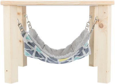 De Trixie Schuilplaats Met Hangmat Sunny Assorti / Grijs van 37 x 37 x 29 cm is een schuilhuisje voor knaagdieren als cavia's met daarin een hangmat. Jouw cavia kan dit huisje zowel als schuilplek of uitkijkplaats gebruiken! Het huisje is gemaakt van onbehandeld hout en eenvoudig te monteren. In het huisje is een hangmat geplaatst, die je eenvoudig in hoogte kunt verstellen voor de verschillende oogjes. De hangmat is gemaakt van zacht pluche en wasbaar met de hand.