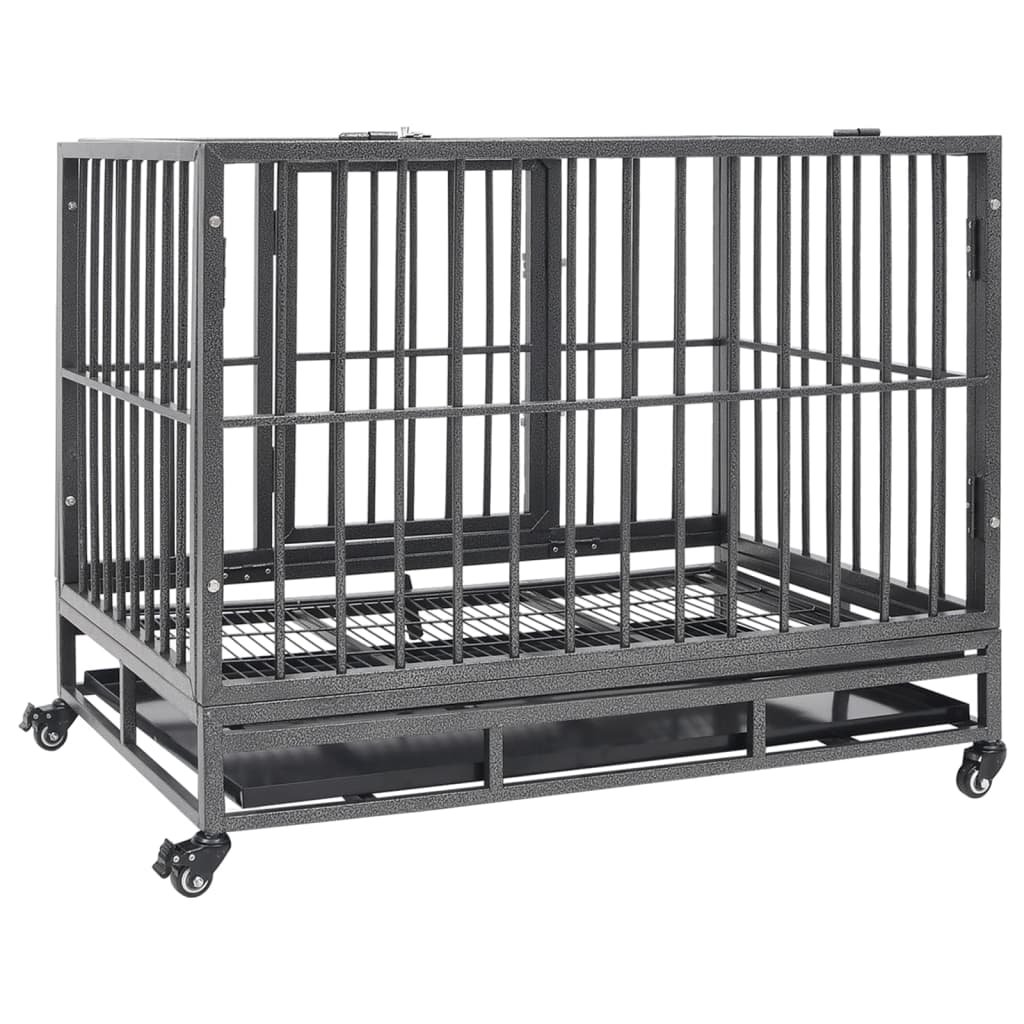 Deze bench is uitgerust met vier wielen voor eenvoudige verplaatsing, en twee daarvan zijn vergrendelbaar om onbedoelde verplaatsing te voorkomen. Hij beschikt over een deur met twee veiligheidsvergrendelingen voor gemakkelijke toegang. Je kunt de hondenbench eenvoudig schoonmaken dankzij het uitneembare ABS-blad. Het stevige, stalen frame zorgt voor optimale ventilatie en zichtbaarheid, wat je hond een comfortabele en betrouwbare omgeving biedt.
