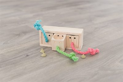 De snack Kubus is een leerzaam speeltje voor het knaagdier. Door aan een van de drie touwen te trekken kan het diertje verwend worden met zijn favoriete versnapering. Hierdoor kan hij lerenderwijs spelen (en knagen) wat goed is als mentale stimulatie.