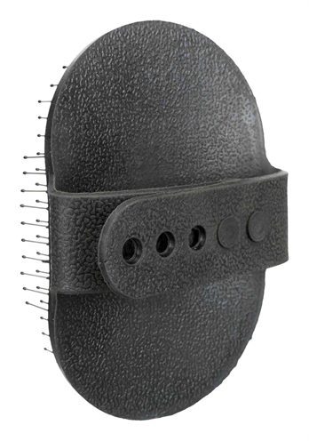 De Trixie Verzorgingsborstel Rubber 13 x 8 cm is een natuurrubberen borstel voor de hond, die helpt het dekhaar en de onderwol te verzorgen bij kort- en ruwharige honden. De borstel is gemaakt van rubber met metalen pinnen met noppen, zodat de borstel goed bij de onderwol kan komen zonder dat borstelen pijnlijk is. De borstel heeft een verstelbare handriem voor prettig gebruik.